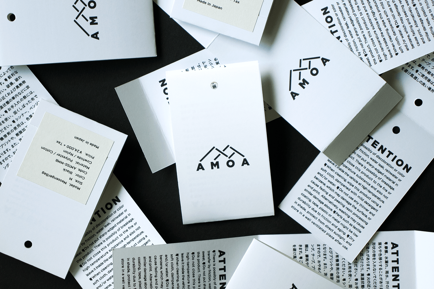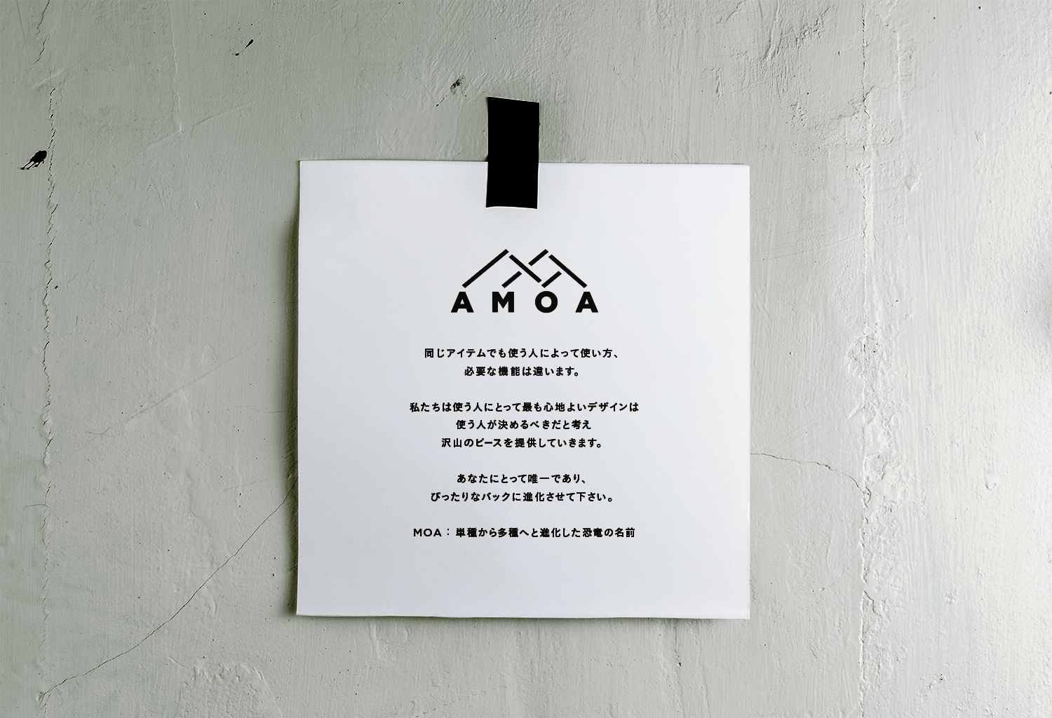 バッグブランドAMOAのブランディングをさせていただきました。アーバンアウトドアなブランドイメージをロゴにも踏襲し“AMOA”で構成した山のシンボルがポイントです。