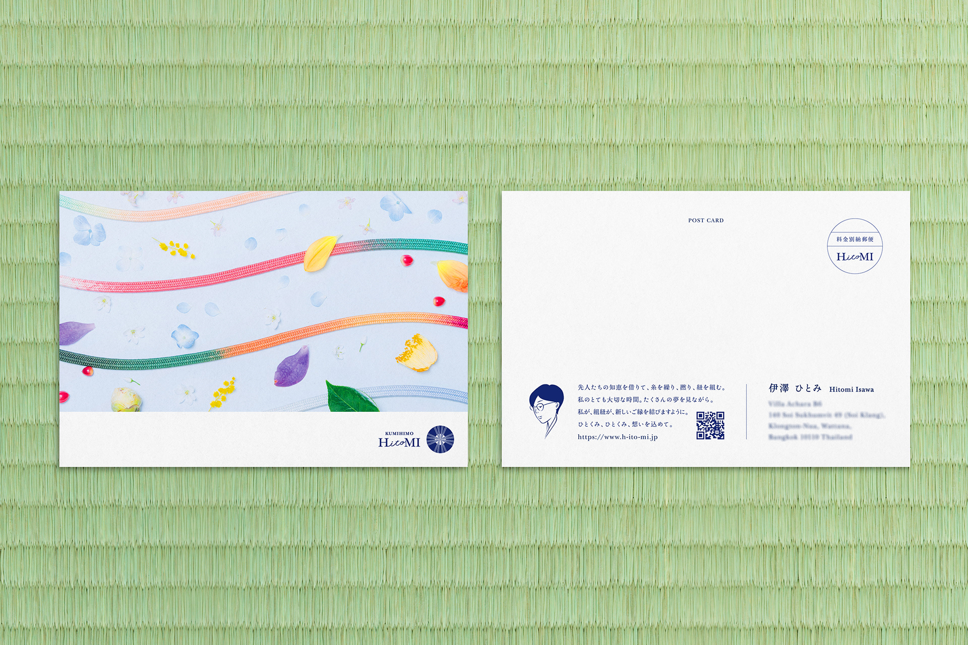 組紐作家HitoMIさんのブランディングをさせていただきました。お名前を英語にした時、組紐の素材である「ito=糸」が入っている事に気付き、ブランド名はあえてそこだけ小文字に。ロゴは、真俯瞰の組台をマークに「ito=糸」の表現として筆記体にしました。名刺は、角度により煌めく和紙を採用しています。